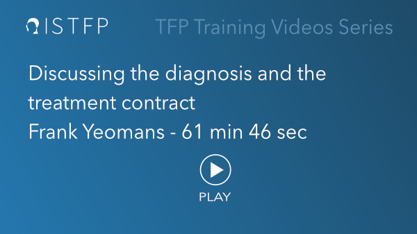Portfolio Category: Contract All acting out affect storm agression assessment attachement breach of contract clarification confrontation contract counter-transference defense diagnosis dominant dyad dropout early phase final phase guilt integration interpretation middle phase Narcissistic Personality negative transference psychopathy résistance STIPO structural interview transference vacations affect storm 1 – Discussing the diagnosis and the treatment contract | Frank Yeomans affect storm 2 – Early test of therapy agreement | Monica Carsky assessment 17 – Structural Interview | Nel Draijer